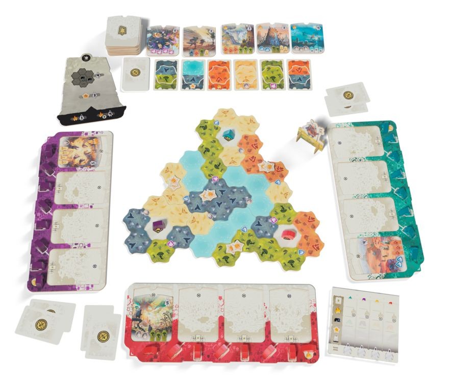 『デワン』は、部族を率いて世界を旅しながら拠点を構えて資源を確保し、他の部族と生き残りを懸けて争うエリアコントロールのゲームです。
